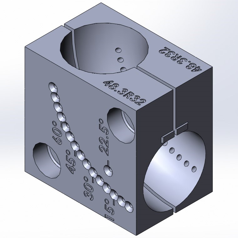 Приспособление помогает зафиксировать отвод в тисках ленточнопильного станка под необходимым для реза углом. Размер изделия рассчитан в том числе для тисков со свободно вращающейся частью. Шип на приспособлении обозначает край реза и полотно пилы идет только по отводу и не повреждает приспособление.