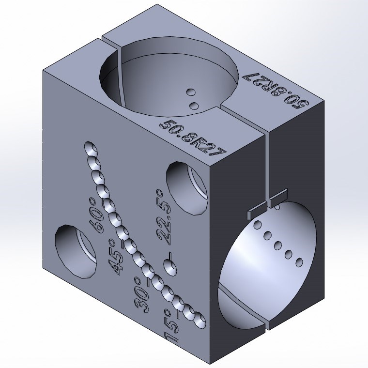 Приспособление помогает зафиксировать отвод в тисках ленточнопильного станка под необходимым для реза углом. Размер изделия рассчитан в том числе для тисков со свободно вращающейся частью. Шип на приспособлении обозначает край реза и полотно пилы идет только по отводу и не повреждает приспособление.