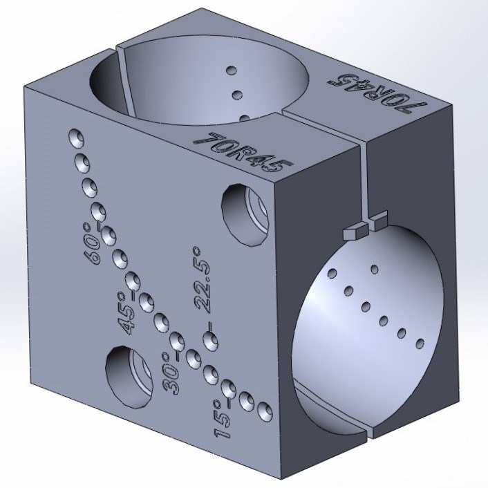Приспособление помогает зафиксировать отвод в тисках ленточнопильного станка под необходимым для реза углом. Размер изделия рассчитан в том числе для тисков со свободно вращающейся частью. Шип на приспособлении обозначает край реза и полотно пилы идет только по отводу и не повреждает приспособление.